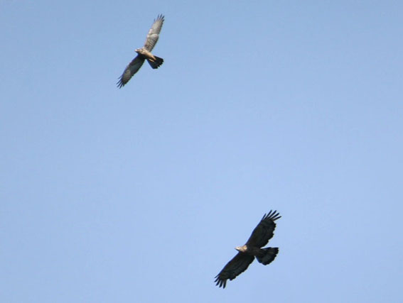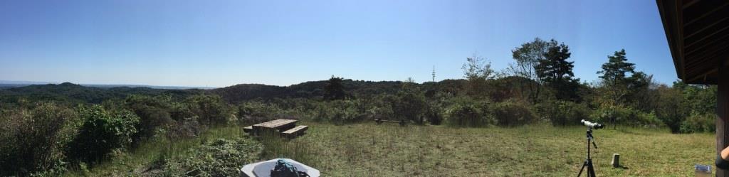 写真は、大鍋展望台、そこからの360度のパノラマ及び上空を舞うサシバ(上側)とハチクマ(下側)です。